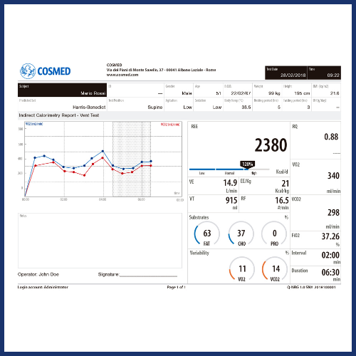 Un nuevo estándar para la industria. Q-NRG ha sido desarrollado en cercana colaboración con institutos reconocidos internacionalmente en el campo del soporte nutricional en unidades de cuidado intensivo. Sus especificaciones y concepto fue diseñado en conjunto con el grupo de estudio del Estudio ICALIC. Mediciones “Gold Standard”. Q-NRG es el resultado de más de 30 años de experiencia en el diseño de sistemas metabólicos. El nuevo calorímetro ha sido validado in-vitro e in-vivo para lograr la mayor precisión y exactitud, con una excelente correlación con mediciones de espectroscopía de masas. Experiencia de usuario optimizada. Q-NRG fue diseñado para minimizar la operación y el tiempo de medición. El sistema no requiere tiempo de preparación previa o calibraciones asistidas por el operador, su usabilidad ha sido diseñada de acuerdo a las prácticas clínicas y de acuerdo a las guías publicadas (ESPEN 2018). Una herramienta para muchas aplicaciones. Q-NRG entrega toda la flexibilidad para una variedad de configuraciones clínicas, evaluando las diferentes condiciones de los pacientes (con ventilación mecánica o respiración espontánea) y con diferentes técnicas (canopy o máscara) , en pacientes adultos o pediátricos (desde los 10 Kg). Diseñado para UCI. La limpieza del sistema ha sido simplificada por el diseño del producto ya que todas las superficies son redondeadas. El circuito de respiración interno está fabricado para evitar que la respiración exhalada no contamine las partes internas. La última tecnología en un diseño compacto. Q-NRG es un dispositivo compacto, ligero y que funciona a batería. Una pantalla táctil LCD de 10.1” simplifica el acceso a todas las operaciones. Interfaces Bluetooth, USB y LAN para conectar el sistema a cualquier otro dispositivo (PC, impresoras, EMR, etc.) Uso independiente o basado en PC. Q-NRG puede ser operado ya sea mediante la pantalla LCD integrada o controlado desde un computador vía el software OMNIA (opcional), con transferencia de datos realizada de forma inalámbrica a través de Bluetooth o USB. La nueva generación de Monitores Metabólicos para Gasto Energético en Reposo en pacientes ventilados y/o con respiración espontánea.- Gasto Energético en reposo en pacientes con ventilación mecánica o respiración espontánea